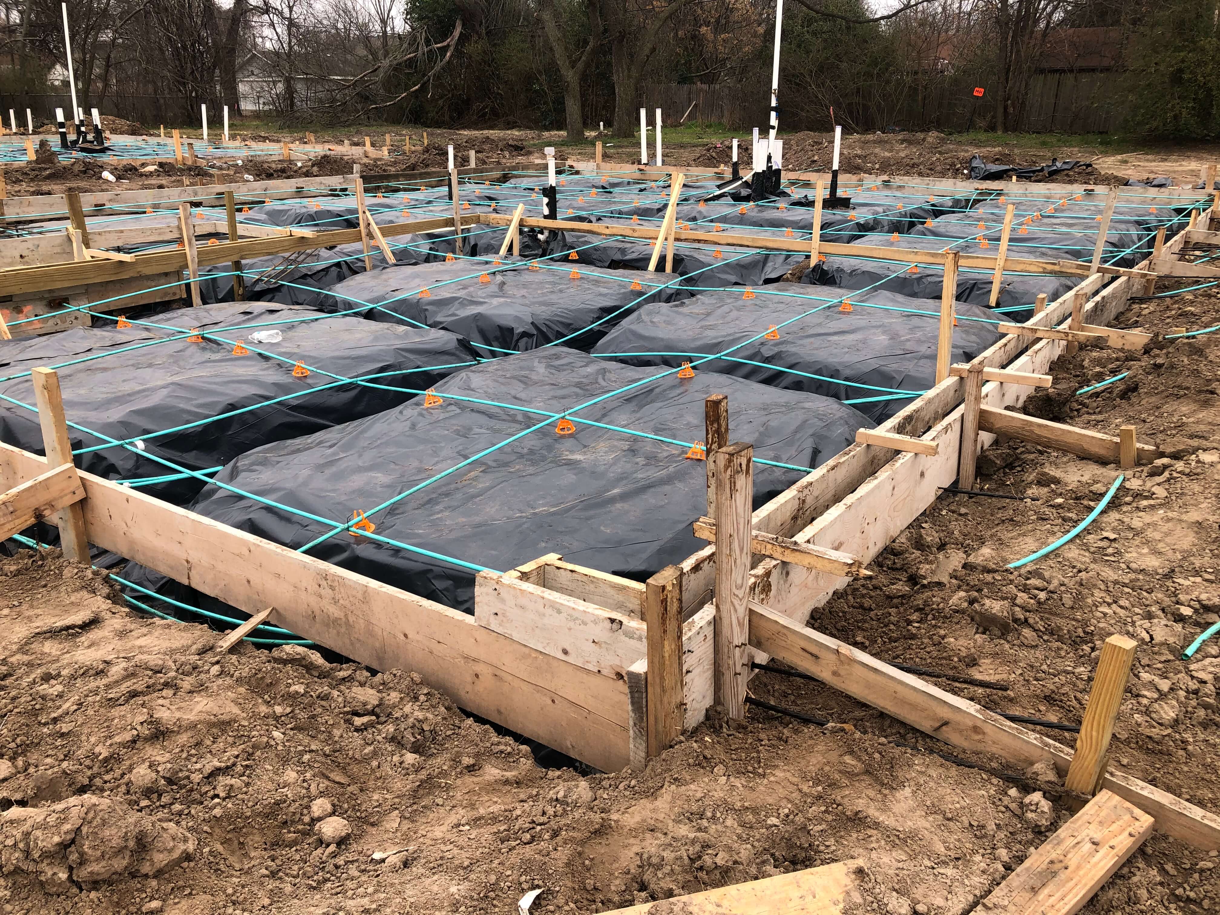 the forms and then the plumber comes and runs pipes, followed by pouring the concrete. Simple and easy, or at least, repetitive.
