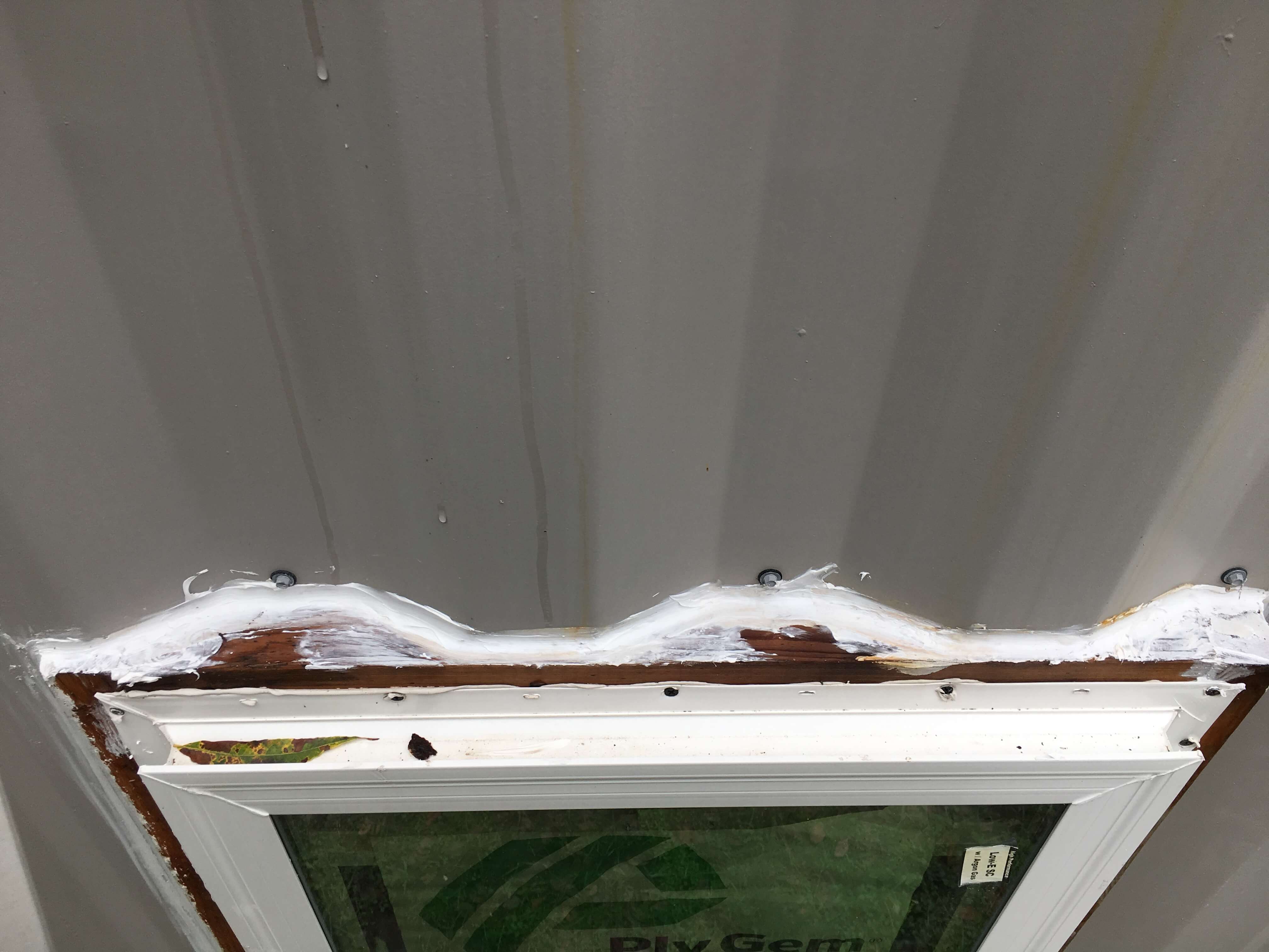 The roof can't stop all rain, of course, especially in Texas where we have monsoon level storms instead of showers. Rain will go sideways on a regular basis. You will have to cut some wood to follow the contours of the corrugated, and then place that on top of the window trim. Since this kind of carpentry is extremely difficult, don't be surprised when it does not fit like a glove. Get the cuts as precise as a you can, and then just go to town with a caulking gun. Then... hope for the best.